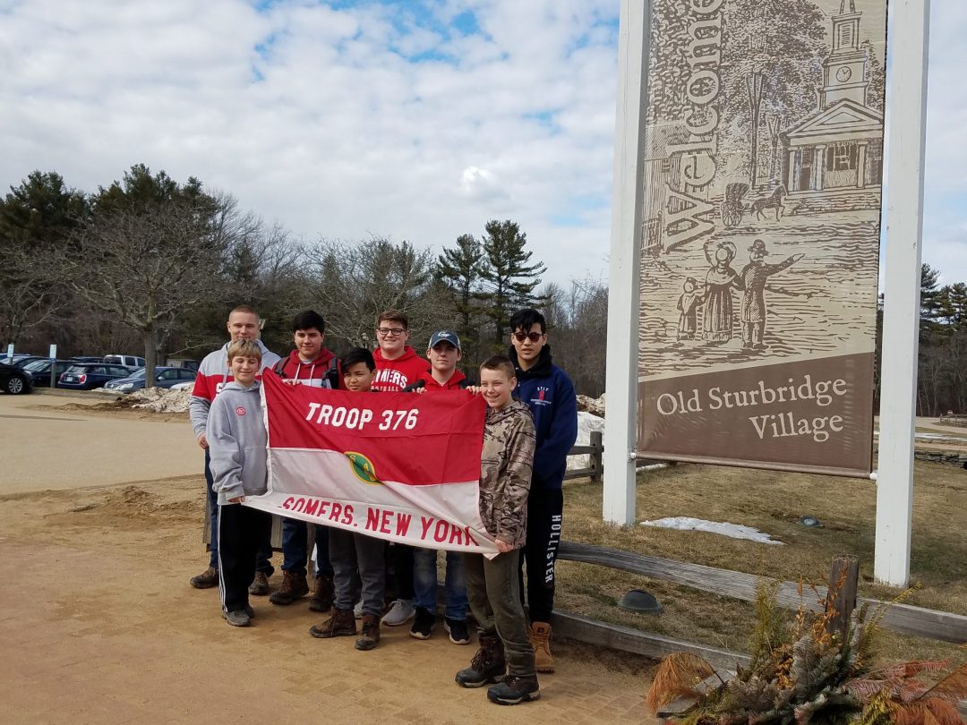 On March 24, 2018, scouts from Somers Troop 376 camped out at Camp Pomperaug in Union, Connecticut and had an amazing time visiting Old Sturbridge Village in Sturbridge, Massachusetts. The boys stepped back in time to the 19th century and learned what life was like from the blacksmith, the tinmaker, bakers, and many other townspeople. The day ended with some rank advancement work and the scouts even prepared 18th century fried chicken and 21st century dump cakes in dutch ovens back at the campsite. We couldn’t ask for a better weekend!