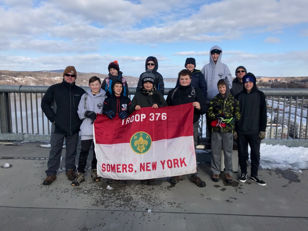 The boys of Troop 376 braved the cold this past weekend and camped out in below freezing temperatures for their first winter campout at Camp Nooteeming. Besides working on their cooking requirements and cold weather camping, they hiked the Walkway Over the Hudson and took in the beautiful views of the Hudson River. Despite a few numb fingers, no one froze to death and all Scouts were accounted for and made it home all in one piece.