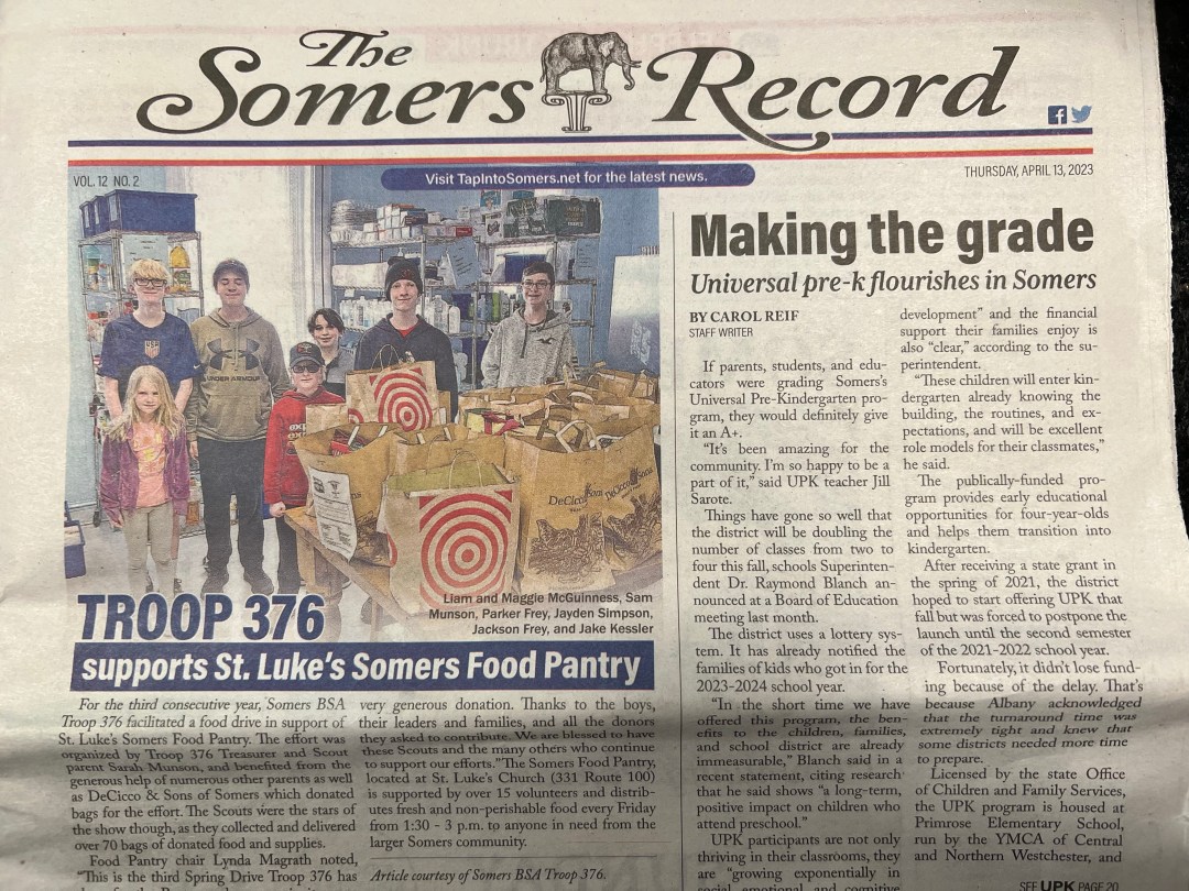 Somers Troop 376 made the front page of the Somers Record as it collected and delivered over 70 bags of non-perishable food and supplies to the St. Luke’s food pantry. The food pantry distributes fresh and non-perishable food every Friday from 1:30-3:00pm to anyone in need from the larger Somers community.