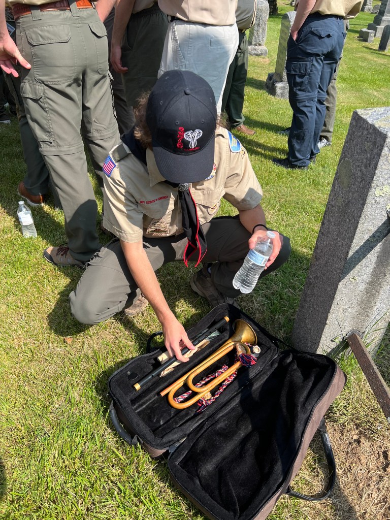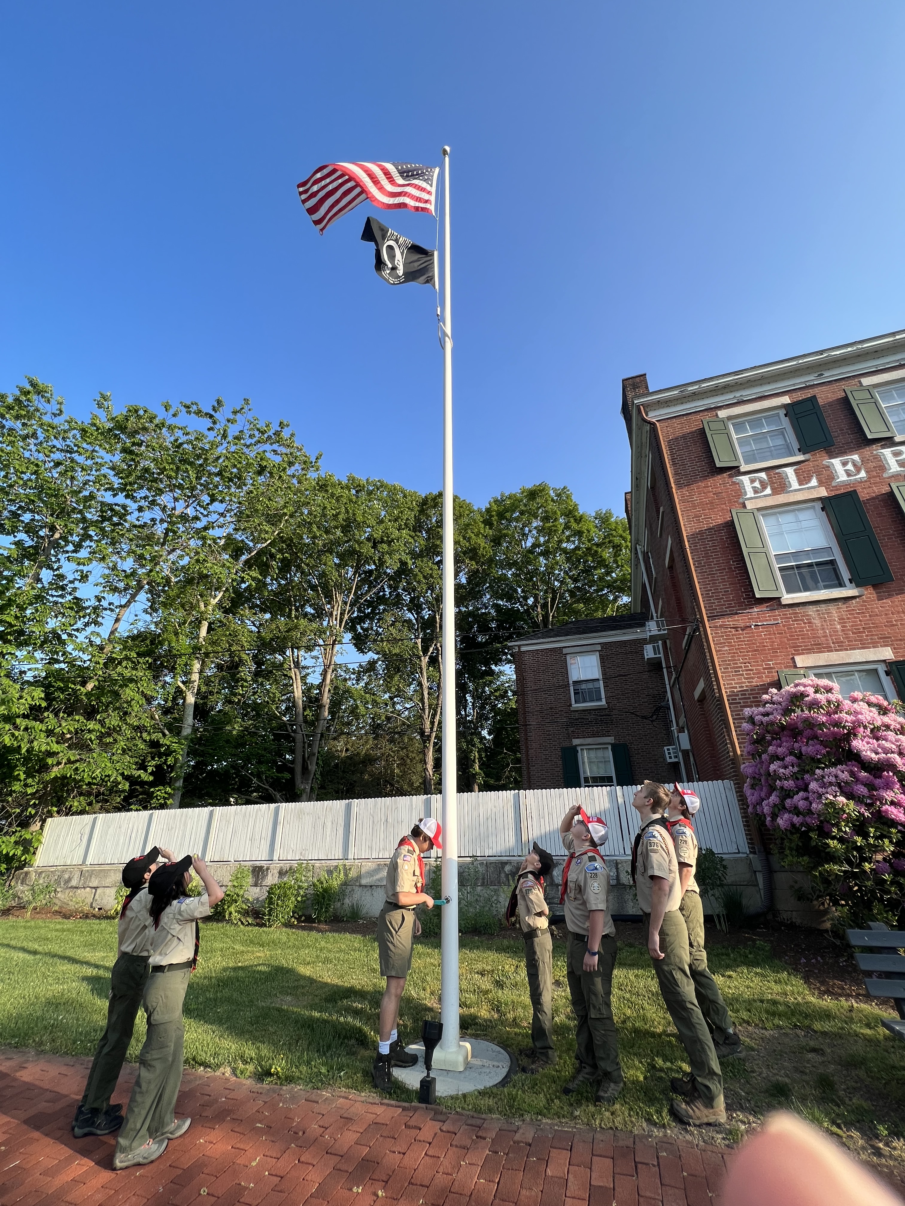 The day began early for several Scouts (Lucas D., Ryan H., Alex S., and Reilly S.) as they helped lower the flags at Ivandell Cemetery and the Elephant Hotel to half-staff shortly after dawn. This honor was shared with our good friends from Somers BSA Troop 228.